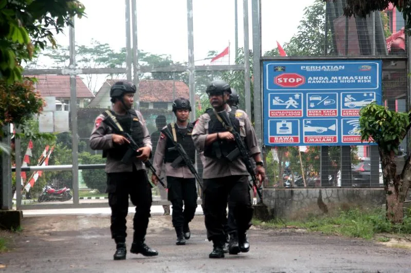 عناصر أمنية إندونيسية تقوم بدوريات في محيط سجن جونونج سيندور في بوجور (أ.ف.ب)
