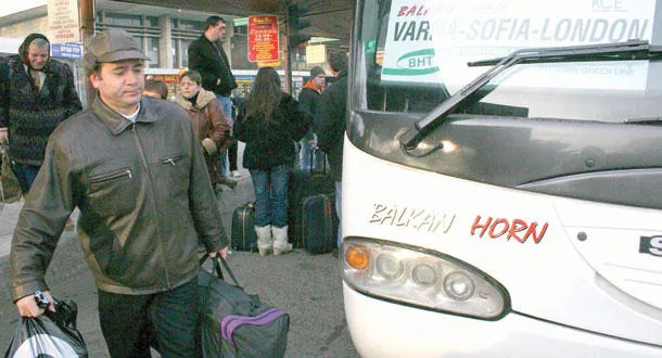 مسافر يستعد لركوب حافلة من مدينة فارنا بالبحر الأسود متجها نحو العاصمة البريطانية لندن عبر صوفيا في أول يوم لرفع القيود الأوروبية (أ.ب)