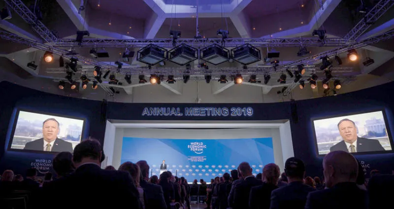 غيّب الإغلاق الحكومي الجزئي الوفد الأميركي عن دافوس هذه السنة، لكنه لم يمنع وزير الخارجية مايك بومبيو من مخاطبة المشاركين فيه، واستعراض موقف بلاده من التحديات السياسية والأمنية والاقتصادية التي يشهدها العالم.