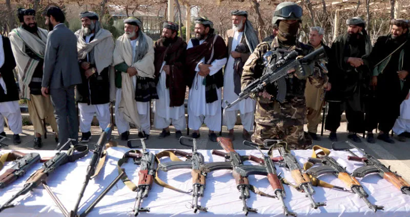 متمردون سابقون يسلّمون أسلحتهم في إطار اتفاق مصالحة مع الحكومة في هيرات بغرب أفغانستان أمس (إ.ب.أ)