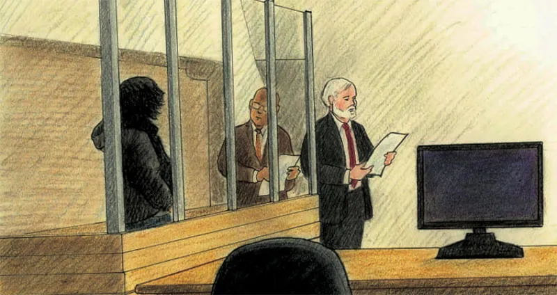 رسم من داخل المحكمة لاستجواب اللاجئ القاصر السورى بدون كشف وجهه بسبب صغر سنه (صورة تلفزيون «سي بي سي»)