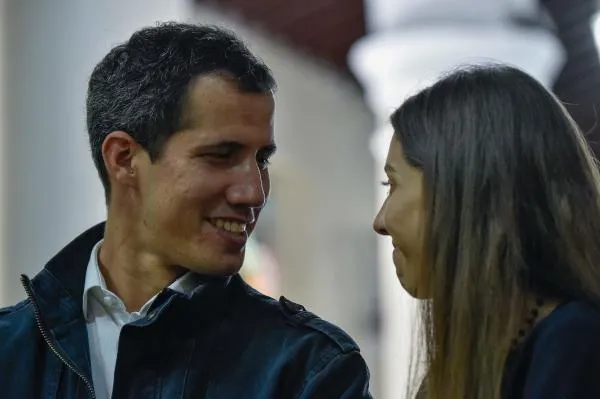 خوان غوايدو وزوجته فابيانا روزاليس خلال مشاركتهما في قداس يوم أمس الأحد (ا.ف.ب)