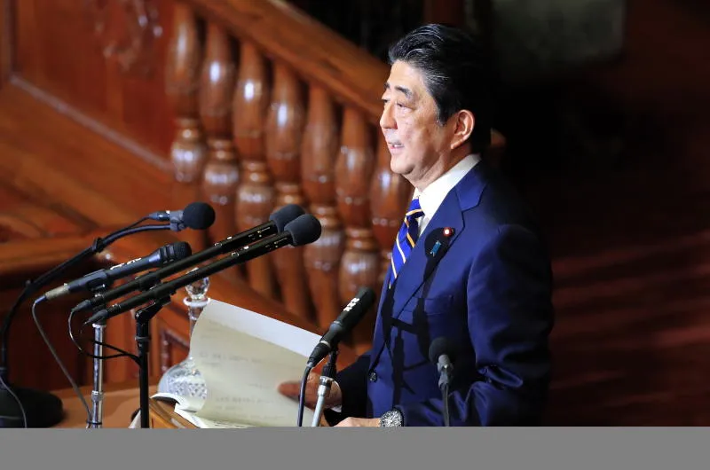رئيس الوزراء الياباني شينزو آبي في خطابه أمام البرلمان (أ.ف.ب)