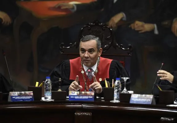 رئيس المحكمة العليا في فنزويلا مايكل مورينو خلال إعلانه منع غوايدو من السفر وتجميد حساباته (ا.ف.ب)