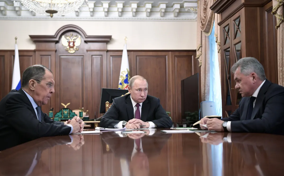 الرئيس الروسي فلاديمير بوتين مجتمعاً مع وزير الخارجية سيرغي لافروف - إلى يمينه - ووزير الدفاع سيرغي شويغو (إ. ب. أ)