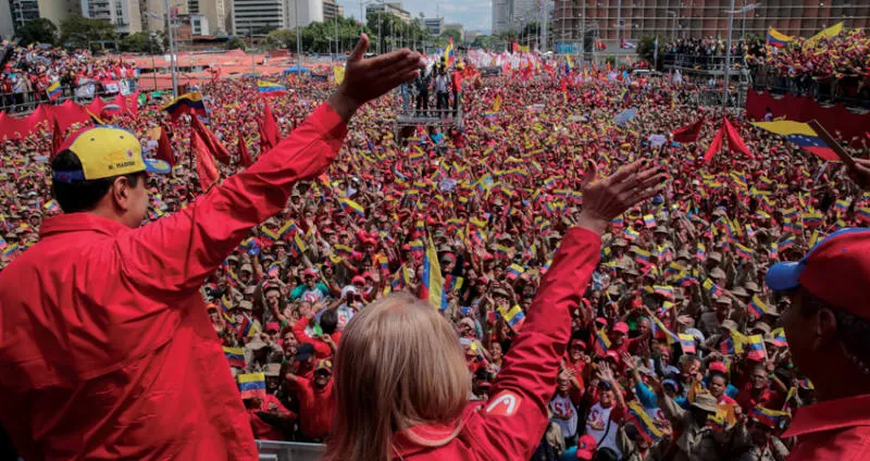 صورة نشرتها الرئاسة الفنزويلية لمادورو وهو يحيي أنصاره في كراكاس أول من أمس (أ.ف.ب)