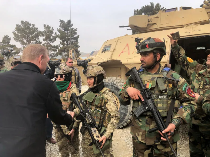 باتريك شاناهان القائم بأعمال وزير الدفاع الأميركي يجتمع مع الكوماندوز الأفغاني في كامب مورهيد بالعاصمة كابل (رويترز)