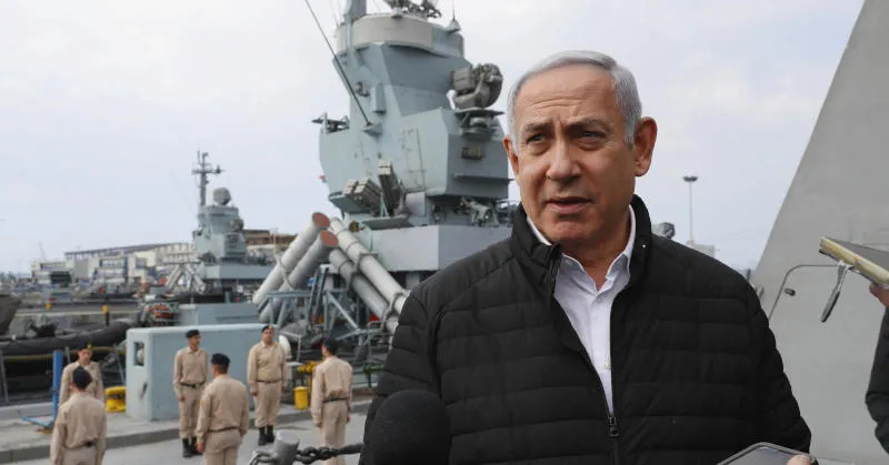 رئيس الوزراء الإسرائيلي بنيامين نتنياهو يتحدث خلال زيارته لقاعدة بحرية في حيفا أمس (رويترز)