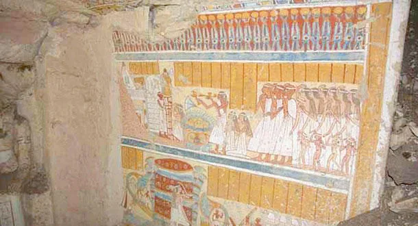 ويقول الأثري محمد سعد الدين لـ«الشرق الأوسط»، إن «المقبرة تزخر بالكثير من النقوش التي تزين أغلب جدرانها، وتجمع صاحب المقبرة بزوجته «موت أم حب» وابنته «ايس آت خا»، واللتين حملتا لقب «مغنية الإلهة موت»، يقفون جميعا ليقدموا القرابين للإلهة، كما تسجل أحد النقوش على الجدران منظرا لأشخاص كثيرة مصطفة في حالة خشوع أمام أحد الطقوس الدينية الجنائزية في العصور الفرعونية، بينما يحمل أحد الجدران نقشا لصاحب المقبرة وزوجته وهما يتعبدان للمعبودين أنوبيس وأوزوريس. وأضاف أن «سقف المقبرة يتجمل أيضا بالكثير من الزخارف الهندسية، من بينها نقش في المنتصف يمثل مركب الشمس بجانبه تعويذة إله الشمس، وأمامهما صاحب المقبرة في حالة من التعبد والخشوع».