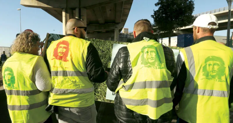 محتجون يرتدون ستراتهم الصفراء وعليها صور غيفارا خلال مسيرات بجنوب فرنسا (أ.ب)