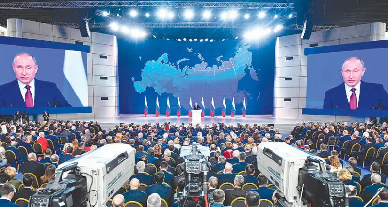 بوتين لدى إلقاء خطابه السنوي في موسكو أمس (أ.ف.ب)