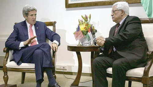 الرئيس الفلسطيني محمود عباس خلال لقائه مع وزير الخارجية الأميركي جون كيري في رام الله أمس (إ.ب.أ)