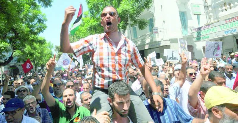 تونسي يطلق شعارات في مظاهرة احتجاجية ضد الإرهاب في العاصمة تونس (أ.ف.ب)