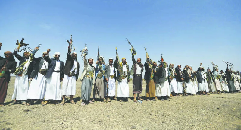 أنصار جماعة الحوثي خلال تجمع في أرحاب شمال صنعاء أمس (رويترز)