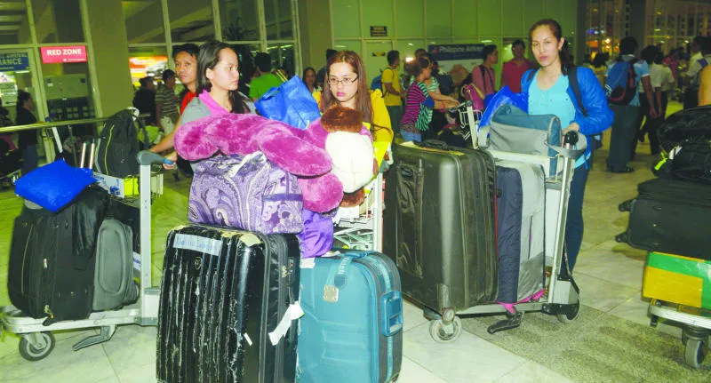 فيلبينيون لدى وصولهم إلى مطار نينوي أكينو في مانيلا أمس بعد مغادرتهم ليبيا جراء تصارع الميليشيات فيها (أ.ف.ب)