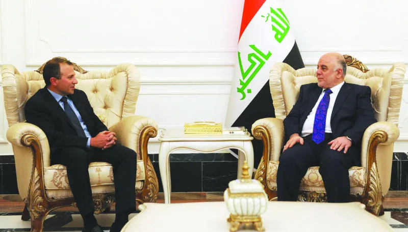رئيس الوزراء العراقي المكلف حيدر العبادي لدى استقباله وزير الخارجية اللبناني جبران باسيل أمس (إ.ب.أ)
