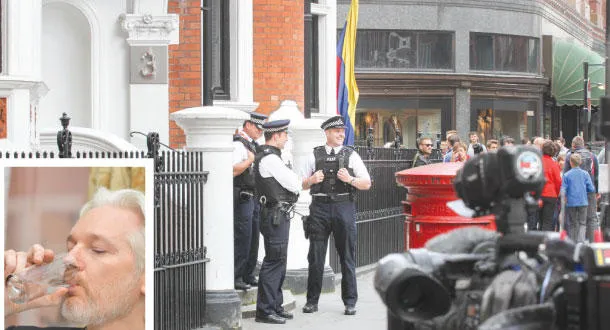 رجال شرطة أمام سفارة الإكوادور في لندن حيث احتشد الإعلاميون بعد توقع قرب خروج أسانج أمس (تصوير: جيمس حنا)، و في الاطار جوليان أسانج (أ.ف.ب)