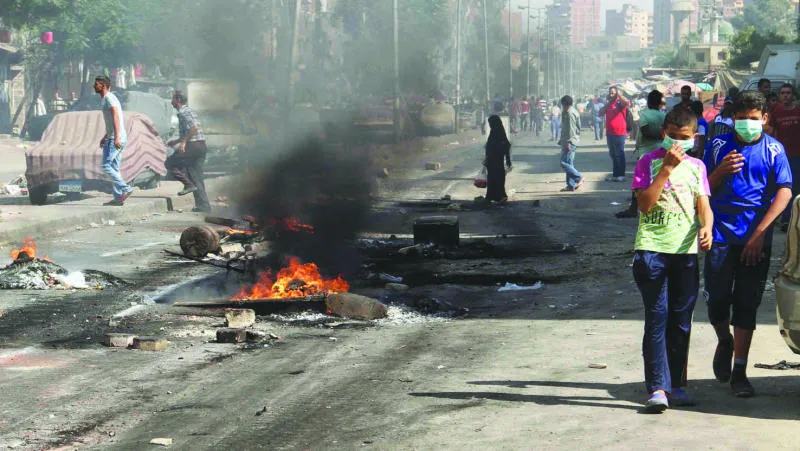 صبيان يسيران وسط ما خلفته المواجهة بين قوات الأمن المصرية ومؤيدي الرئيس السابق محمد مرسي في حي المطرية أمس (إ.ب)