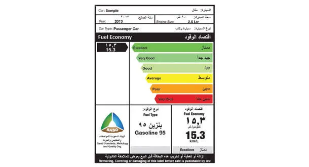 أمام ذلك، قامت وزارة التجارة والصناعة السعودية بإلزام وكلاء الشركات المصنعة للسيارات بوضع البطاقة على السيارات الخفيفة من موديلات 2015 فما فوق على مرحلتين، الأولى اعتبارا من شهر أغسطس (آب) الحالي وتشمل صالات عرض السيارات، والأخرى اعتبارا من مطلع يناير (كانون الثاني) المقبل تشمل جميع المركبات الواردة. وتبيّن البطاقة للمستهلك مدى استهلاك الطاقة لكل طراز من المركبات، حيث جرى تصنيف قيم اقتصاد الوقود إلى ستة مستويات: (ممتاز، جيد جدا، جيد، متوسط، سيئ، وسيئ جدا)، فيما تحمل البطاقة عدة معلومات عن المركبة، منها: (نوع السيارة، سنة الصنع، سعة المحرك، نوع الوقود المستخدم، اقتصاد الوقود، عدد الكيلومترات، وحجم اللترات). وبحسب معلومات حديثة، يستأثر قطاع النقل بما نسبته 25 في المائة من استهلاك السعودية من الطاقة الأولية، فيما يعد معدل اقتصاد الوقود في المركبات الواردة إلى السعودية منخفضا مقارنة بالمعدلات العالمية. ولتحسين اقتصاد الوقود في مركبات النقل الخفيف، جرى إلزام المصنّعين بتقديم تقارير اقتصاد الوقود اعتبارا من نوفمبر (تشرين الثاني) 2013، واستحداث بطاقة لاقتصاد الوقود في مركبات النقل الخفيف واعتمادها من قبل الهيئة السعودية للمواصفات والمقاييس والجودة، وتطبيقها اعتبارا من أغسطس الحالي.