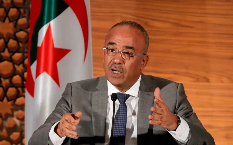 رئيس الوزراء الجزائري نور الدين بدوي يتحدث خلال المؤتمر الصحافي (رويترز)