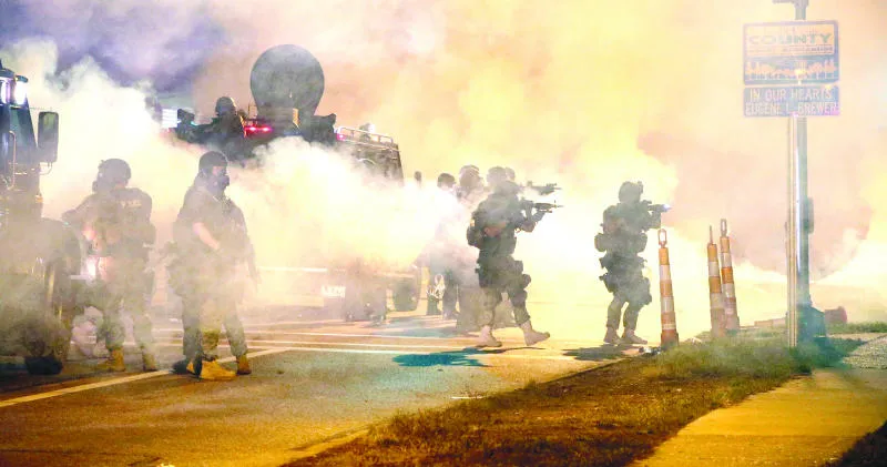 رجال شرطة يواجهون المتظاهرين مساء أول من أمس في فيرغسون..والصورة مأخوذة بعدسة مصورة وكالة «غيتي» سكوت أولسون الذي اعتقل أمس لساعات عدة (أ.ف.ب)
