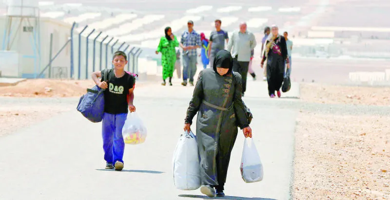 لاجئون سوريون لدى وصولهم إلى مخيم أزرق شرق عمان أمس (رويترز)