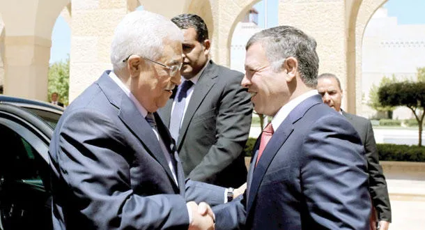 العاهل الأردني الملك عبد الله الثاني لدى استقباله رئيس السلطة الفلسطينية في عمان أمس (إ.ب.أ)