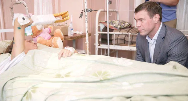 رئيس برلمان نوفوروسيا أوليغ تساريف خلال زيارته لطفلة أصيبت في المعارك الدائرة بدونيتسك (إ.ب.أ)