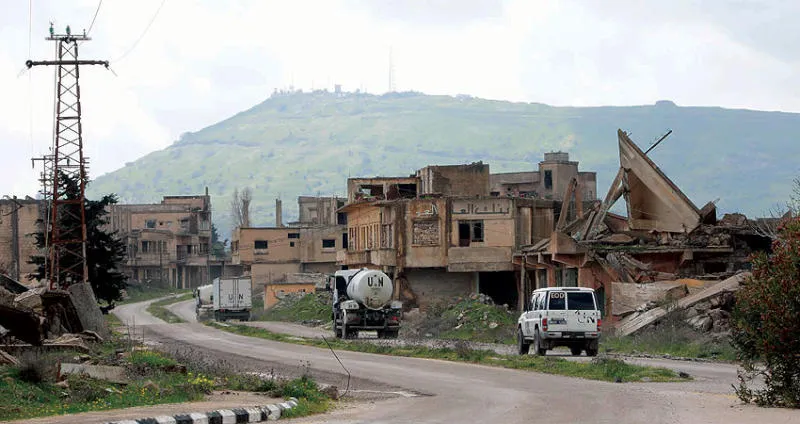 عربتان تابعتان للأمم المتحدة في القنيطرة بالجولان أمس (أ.ف.ب)