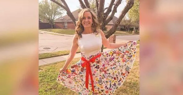 معلمة أميركية ترتدي فستاناً يحمل رسومات تلاميذها
