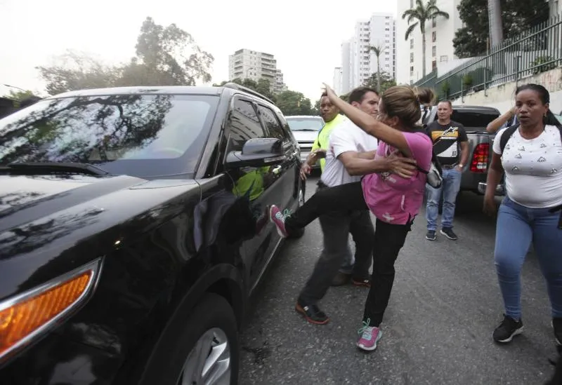 مؤيّدة للرئيس الفنزويلي نيكولاس مادورو تركل سيارة في موكب ينقل زعيم المعارضة خوان غوايدو إلى تجمع لمناصريه في كراكاس (أ. ب)