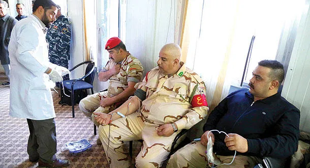 جنود عراقيون يتبرعون بالدم لجرحى العمليات العسكرية في الأنبار أمس (أ.ب)