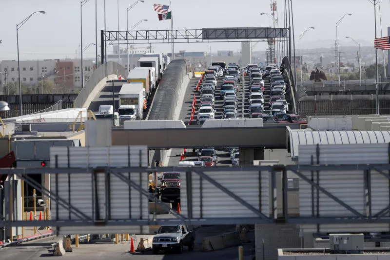 السيارات والشاحنات تصطف لدخول الولايات المتحدة من المكسيك عند معبر حدودي قرب تكساس (أ.ب)
