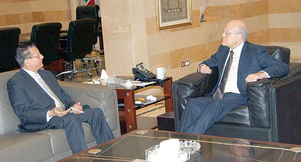 رئيس الوزراء اللبناني المكلف نجيب ميقاتي لدى اجتماعه بوزير خارجيته عدنان منصور في بيروت أمس (دالاتي ونهرا)