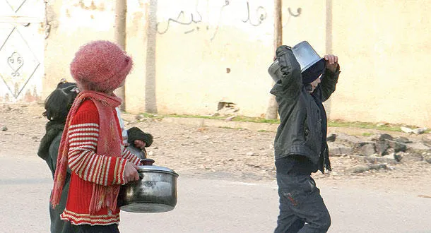أطفال سوريون يحملون قدورا فارغة بحثا عن الطعام في أحد شوارع الغوطة الشرقية قرب دمشق (رويترز)
