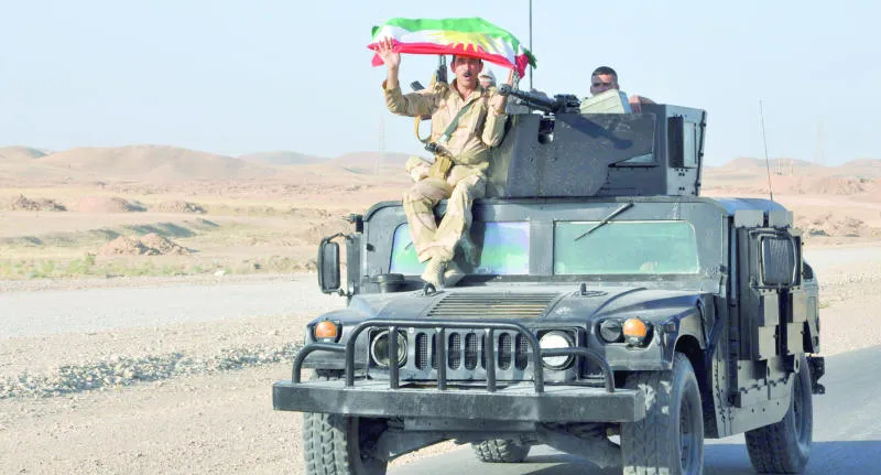 عنصر في قوات البيشمركة يرفع علم كردستان وهو جالس على عربة عسكرية خلال مواجهات في جلولاء أول من أمس (رويترز)