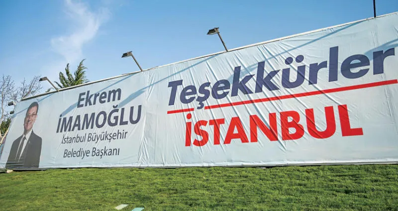 لافتة لمرشح حزب الشعب الجمهوري أكرم إمام أوغلو تشكر اسطنبول على انتخابه (أ.ف.ب)