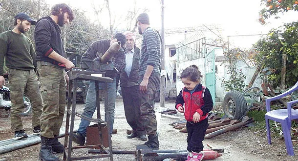 مقاتلون معارضون للنظام السوري يصنعون قذائف بدائية في ريف اللاذقية (رويترز)