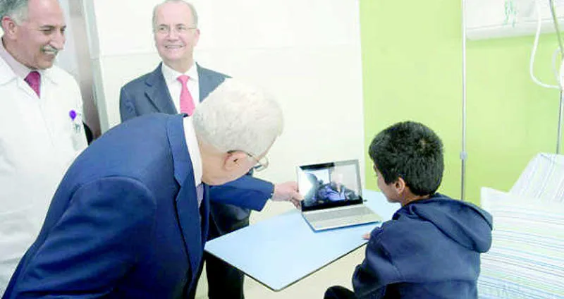 الرئيس الفلسطيني محمود عباس لدى افتتاحه قسم السرطان وأمراض الدم في المستشفى الاستشاري أمس (وفا)