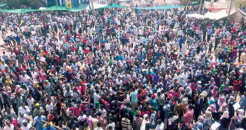 حشود هائلة من المتظاهرين أمام مقر قيادة الجيش في الخرطوم أمس (أ.ف.ب)