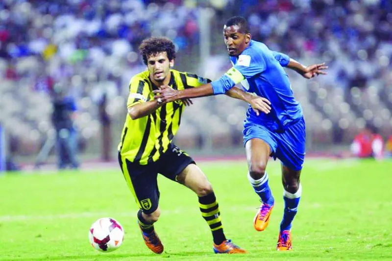 صراع على الكرة بين عبدالله الزوري من الهلال ومحمد العمري من الاتحاد في المباراة التي انتهت بالتعادل 2/2 (تصوير: عبد الله بازهير)