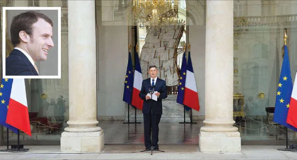 السكرتير العام لقصر الإليزيه جان بيير جوي يعلن تشكيلة الحكومة الفرنسية الجديدة أمس .. وفي الإطار صورة أرشيفية لوزير الاقتصاد الفرنسي الجديد إيمانويل ماكرون (أ.ف.ب)