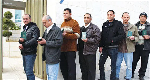 مصريون يتنظرون دورهم للإدلاء بأصواتهم على الدستور خارج سفارة بلادهم في الأردن أمس (رويترز)