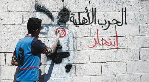 ناشط يمني يكتب على جدار في أحد الشوارع أثناء حملة ضد «الحرب الأهلية» في العاصمة صنعاء أمس (أ. ف. ب)