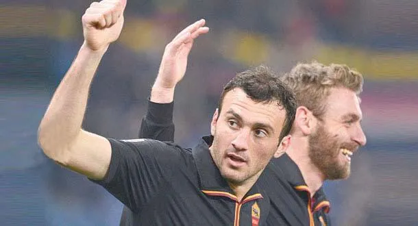 لاعب روما توروسيديس يحتفل مع دانييلي دي روسي بهدف الفوز على سامبدوريا (أ.ب)