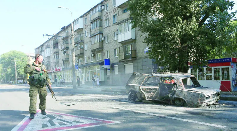 جندي من الموالين لروسيا يتأمل بقايا سيارة محروقة توفي ركابها بسبب هجوم نفذته القوات الأوكرانية أمس في دونيتسك حسب بعض الشهود (رويترز)
