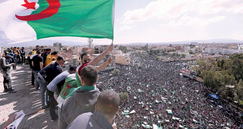 حشود ضخمة خرجت في برج بوعريريج شرق العاصمة الجزائرية أمس للمطالبة برحيل النظام (أ.ب)