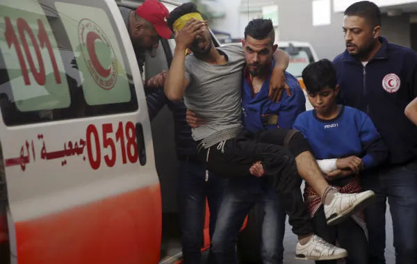 مسعفون يحملون فلسطينياً أصيب برصاص الجيش الإسرائيلي خلال مسيرات الجمعة (ا.ب)