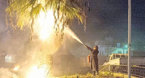 رجل أمن يطفئ نيرانا أضرمت في إحدى الأشجار بعد أعمال الشغب التي شهدتها منطقة «حي التضامن» غرب تونس العاصمة ليلة الجمعة (أ.ب)