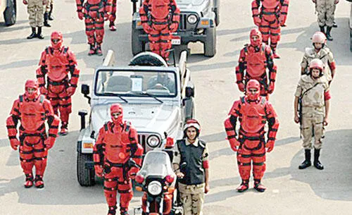 صورة وزعتها القوات المسلحة المصرية لجنود يرتدون ملابس حمراء ستكون مهمتهم تأمين الاستفتاء على الدستور الجديد خلال يومي 14 و 15 الحالي (إ.ب.أ)